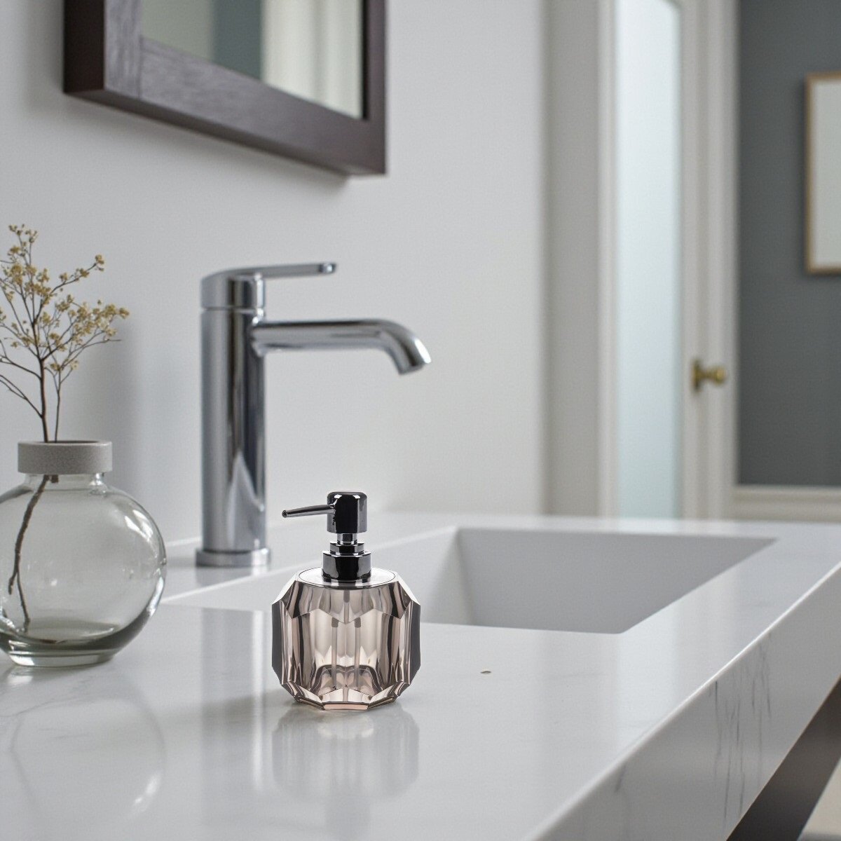 Şeffaf akrilik malzemeden üretilen bu sıvı sabunluk, şık ve modern tasarımıyla her banyoya veya mutfağa zarif bir dokunuş katıyor. Yüksek kaliteli malzemelerden üretilen bu sabunluk, dayanıklı ve şeffaf yapısıyla uzun ömürlü kullanım sağlar. Geometrik tasarımı, ışığı yansıtarak ortamınıza zarif bir estetik katarken, kullanım kolaylığı sunar. Chrome detaylarıyla şıklığını tamamlar ve her alana uyum sağlar.