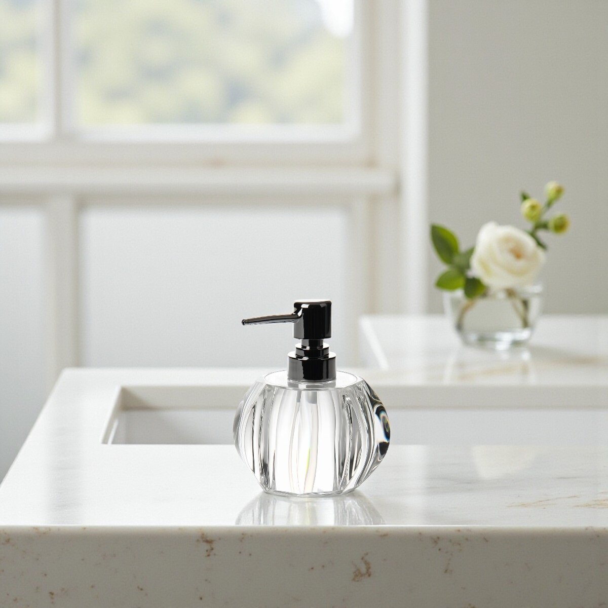 Şeffaf akrilik malzemeden üretilen bu sıvı sabunluk, şık ve modern tasarımıyla her banyoya veya mutfağa zarif bir dokunuş katıyor. Yüksek kaliteli malzemelerden üretilen bu sabunluk, dayanıklı ve şeffaf yapısıyla uzun ömürlü kullanım sağlar. Geometrik tasarımı, ışığı yansıtarak ortamınıza zarif bir estetik katarken, kullanım kolaylığı sunar. Chrome detaylarıyla şıklığını tamamlar ve her alana uyum sağlar.