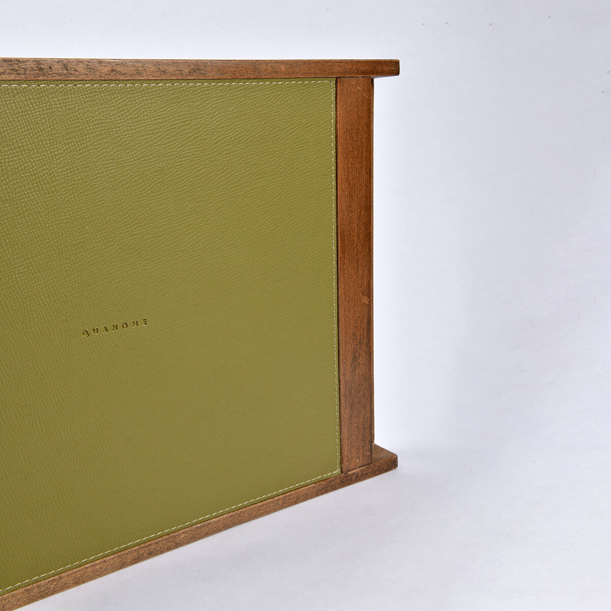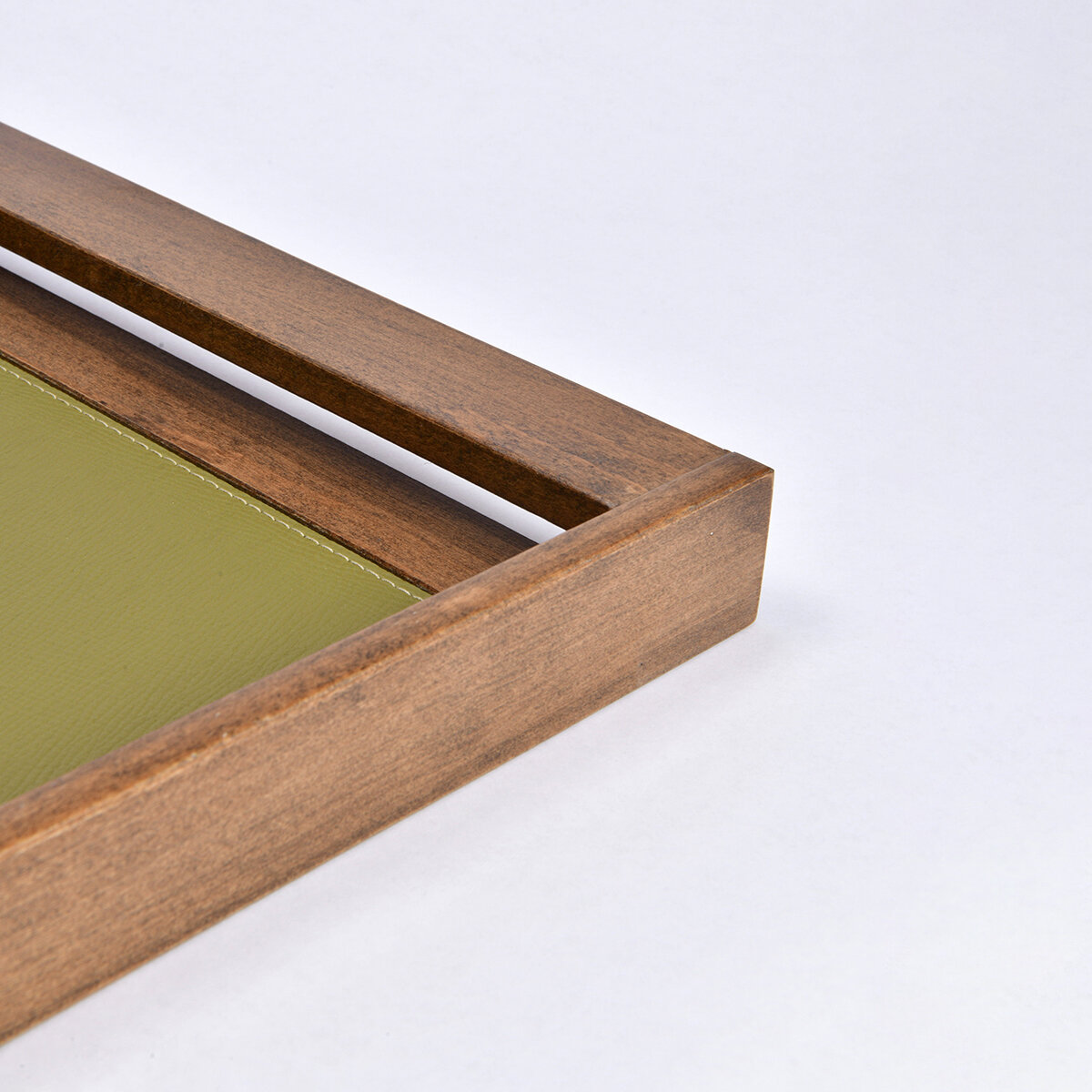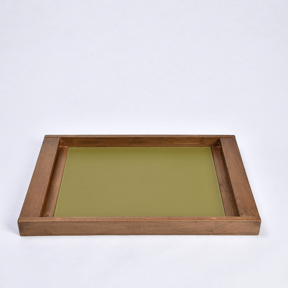 45×30 cm ölçüsü, kahvaltı servisi, çay-kahve ikramları veya atıştırmalık sunumları için geniş bir alan sunar. Ahşap yapısı dayanıklı ve uzun ömürlü kullanım sağlar, deri detaylar ise modern tasarım dokusunu güçlendirir. Tepsinin yüzeyi kolay temizlenebilir; nemli bir bezle silinmesi yeterlidir.
