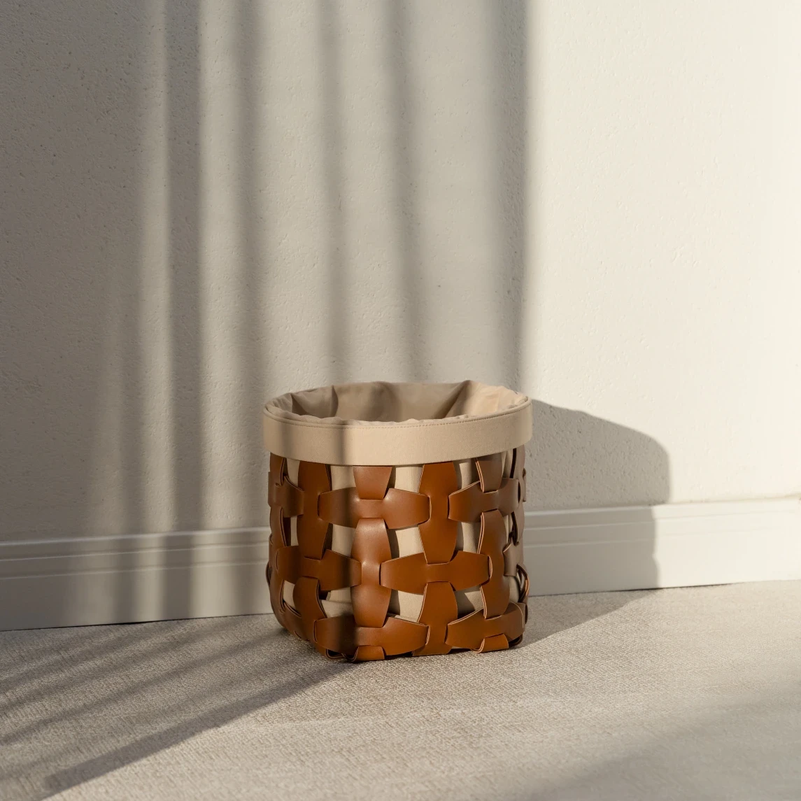 Royce deri örgü sepet, doğal derinin sıcaklığını zarif el işçiliğiyle birleştiriyor. Hem işlevsel hem de şık tasarımıyla evinize sofistike bir görünüm kazandırıyor.