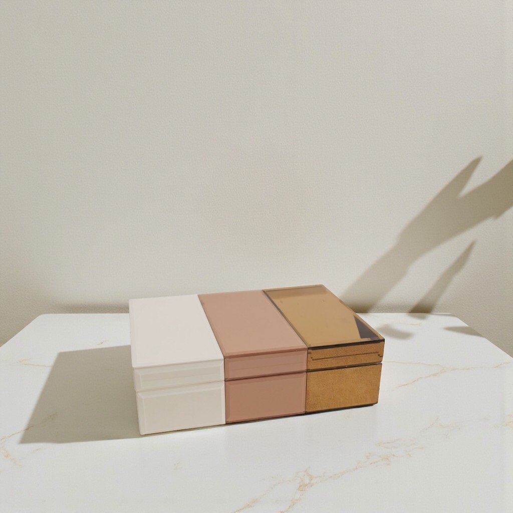 Modern ve şık bir tasarıma sahip Joal Tasarım Kutu Küçük, minimalist çizgileri ve zarif renk geçişleriyle her alanda estetik bir düzen yaratır. Şeffaf camdan üretilmiş bu kutu, beyaz, pembe, kahverengi ve kahverengi tonlarında dört ayrı bölmeden oluşur. Fonksiyonel yapısı sayesinde ofislerde, yatak odasında veya oturma odasında düzenleyici olarak kullanılabilir. Hem dekoratif hem de pratik olan Joal Tasarım Kutu Küçük, düzeni sağlarken mekanınıza modern bir hava katacak.