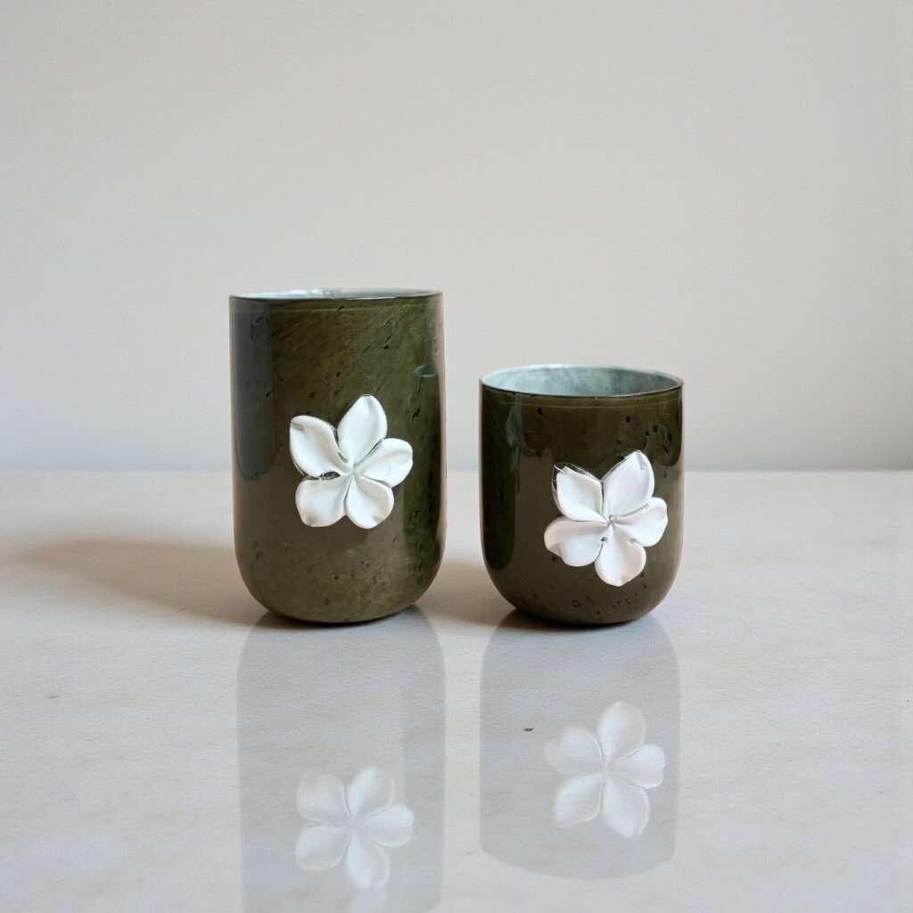 Her bir vazoda yer alan beyaz çiçek kabartma detayı, sade tasarıma sofistike bir karakter kazandırırken; koyu yeşil cam yapısı modern ve doğal bir görünüm sunar.