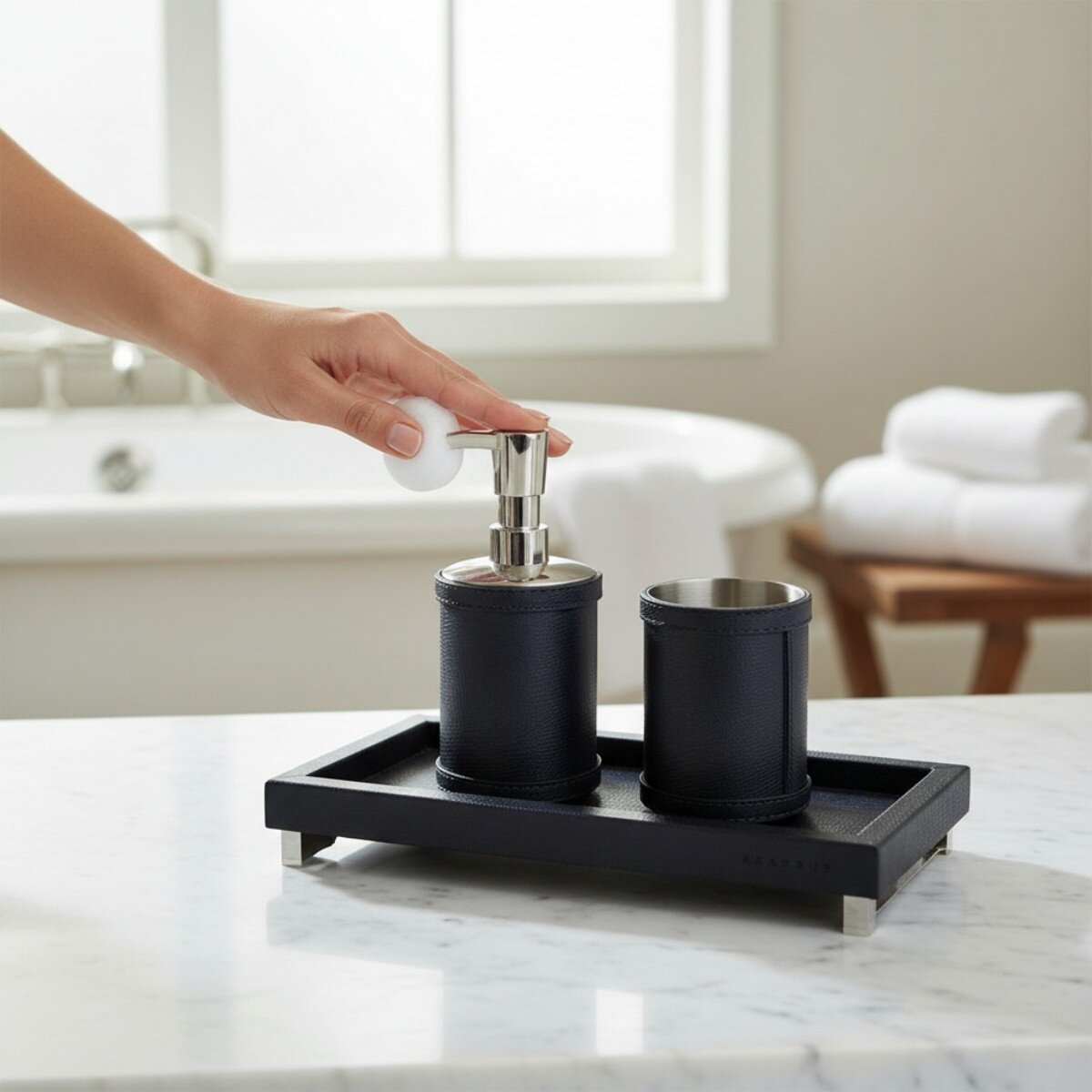 Kaliteli deri dokusu ile uzun ömürlü kullanım sağlar ve kolay temizlenebilir yapısı sayesinde günlük hijyen rutininize uyumlu bir parça olur. Lacivert tonu, nötr ve canlı renklerle uyum sağlayarak banyonuza hem modern hem de sofistike bir hava kazandırır.
