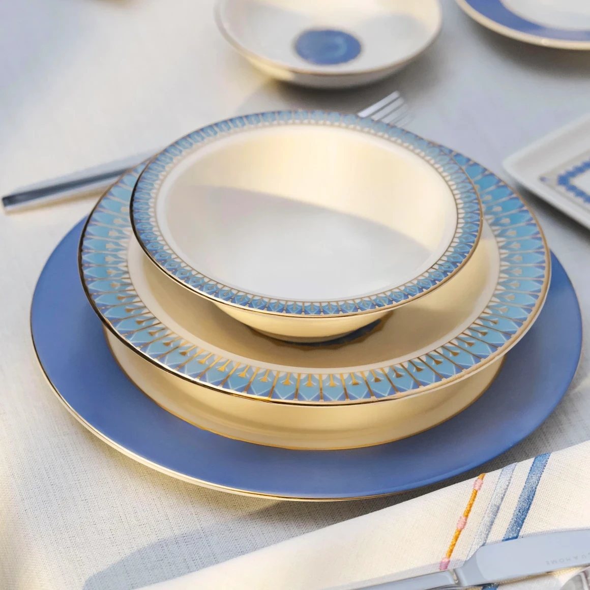 Giselle Mavi Gold koleksiyonu, zarif mavi tonları ve gold detaylarıyla sofralarınıza lüks ve şıklık katıyor. Estetik tasarımı ve kaliteli malzemesi sayesinde özel davetlerden günlük kullanıma kadar her sofraya zarafet ve sofistike bir hava kazandırıyor.