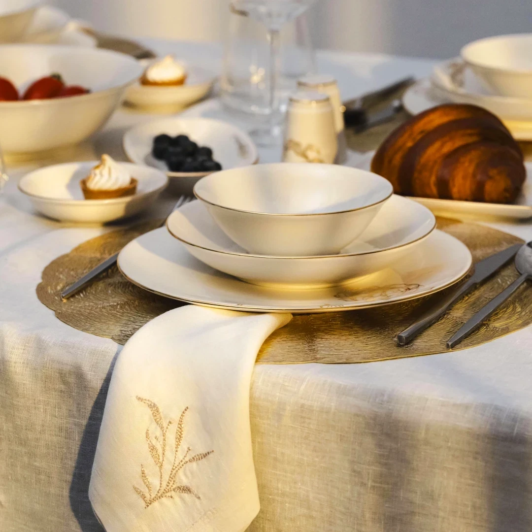 Lyra Gold koleksiyonu, porselen ve altının göz kamaştırıcı ışıltısını sofralarınıza taşıyor. Zarif tasarım detayları, yemek sunumlarınızı lüks bir deneyime dönüştürüyor ve her öğünü unutulmaz kılıyor.