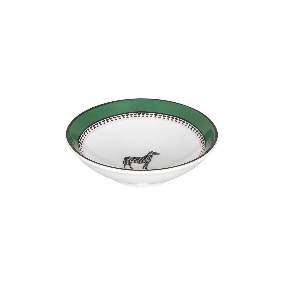 Kâsenin merkezinde yer alan siyah-beyaz zebra figürü, tasarımı çevreleyen canlı orman yeşili geniş kenar ve ince geometrik desenli şerit ile kusursuz bir uyum yakalar. Dış kenarı saran siyah ince çizgi ise tasarımın net duruşunu tamamlar. 10 cm'lik pratik boyutuyla soslar, zeytinyağı ikramları, çerezler, mini mezeler veya şık kahvaltılık sunumlarınız için ideal ve estetik bir alternatiftir.