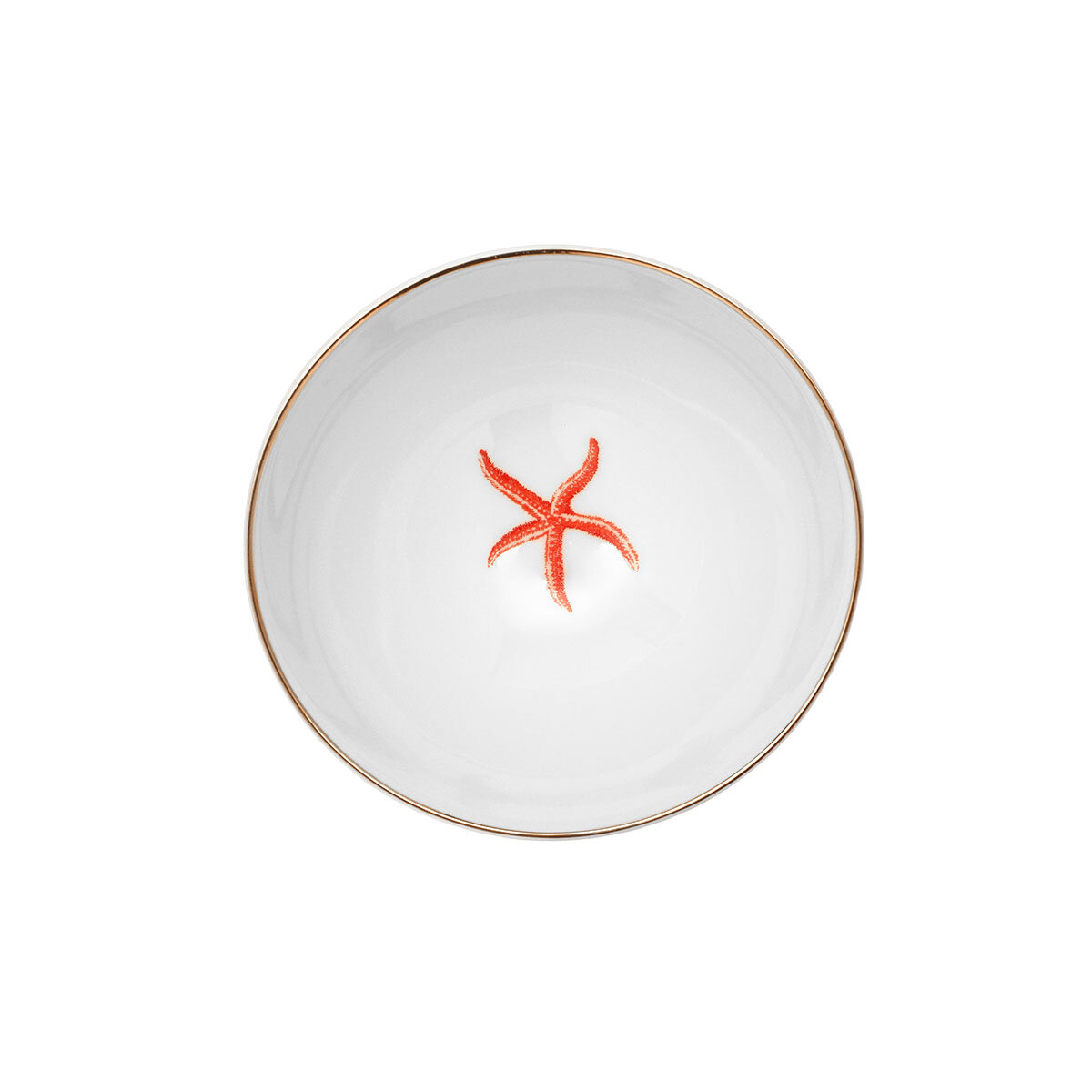 Kasenin dış yüzeyini zarifçe saran kırmızı mercan dalı deseni, iç tabanına gizlenmiş detaylı deniz yıldızı figürüyle kusursuz bir uyum ve sürprizli bir şıklık sunar. Saf beyaz porseleni dıştan çevreleyen ince gold yaldız şerit ise koleksiyonun lüks çizgisini net bir şekilde vurgular. 12 cm'lik minimal ve pratik boyutuyla sofralarınızda yer kaplamadan kusursuz bir estetik ve fonksiyonellik sağlar.