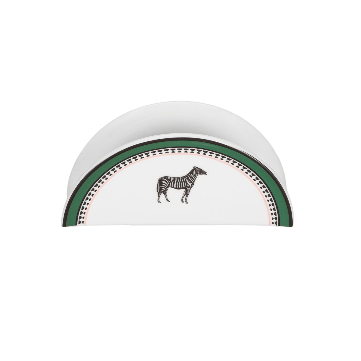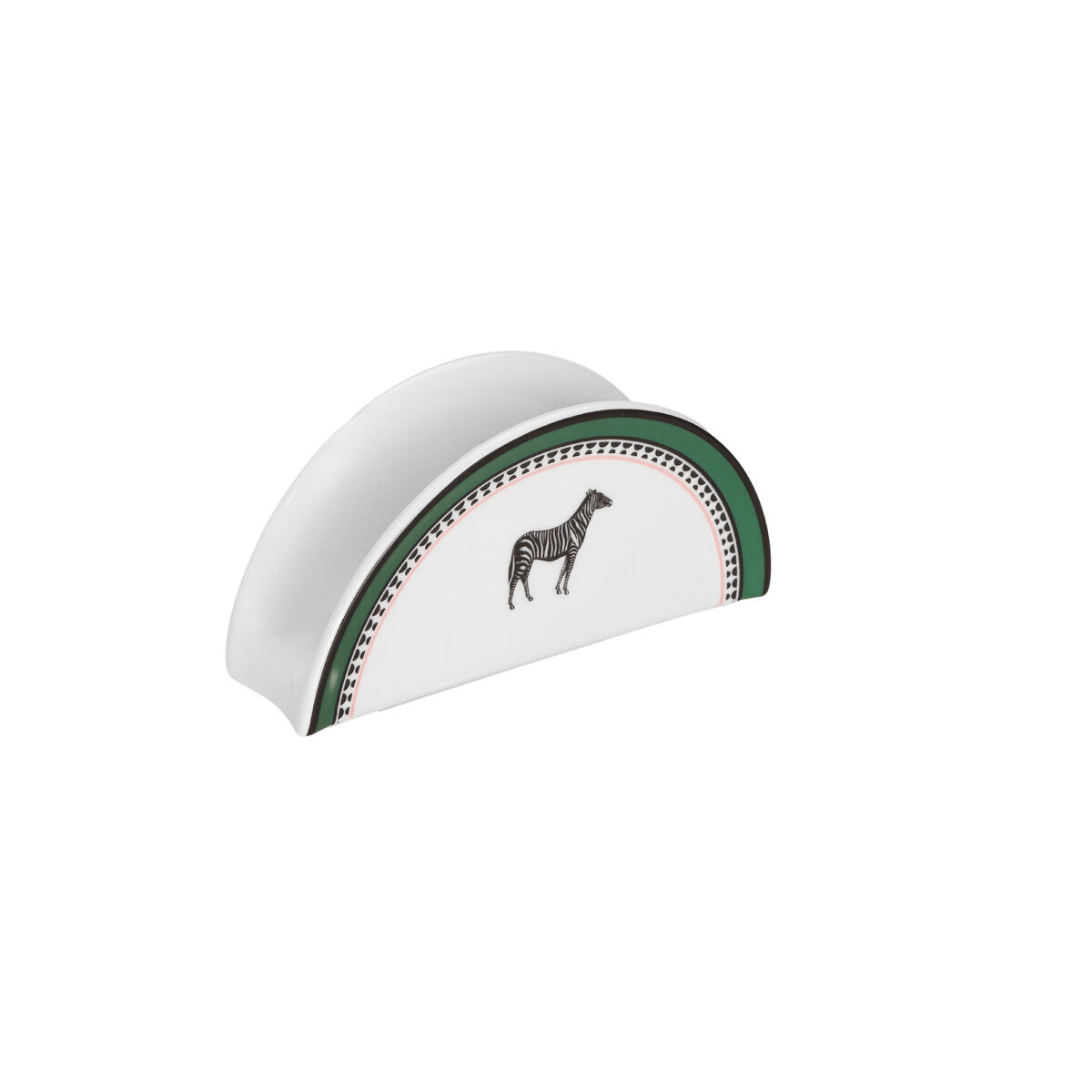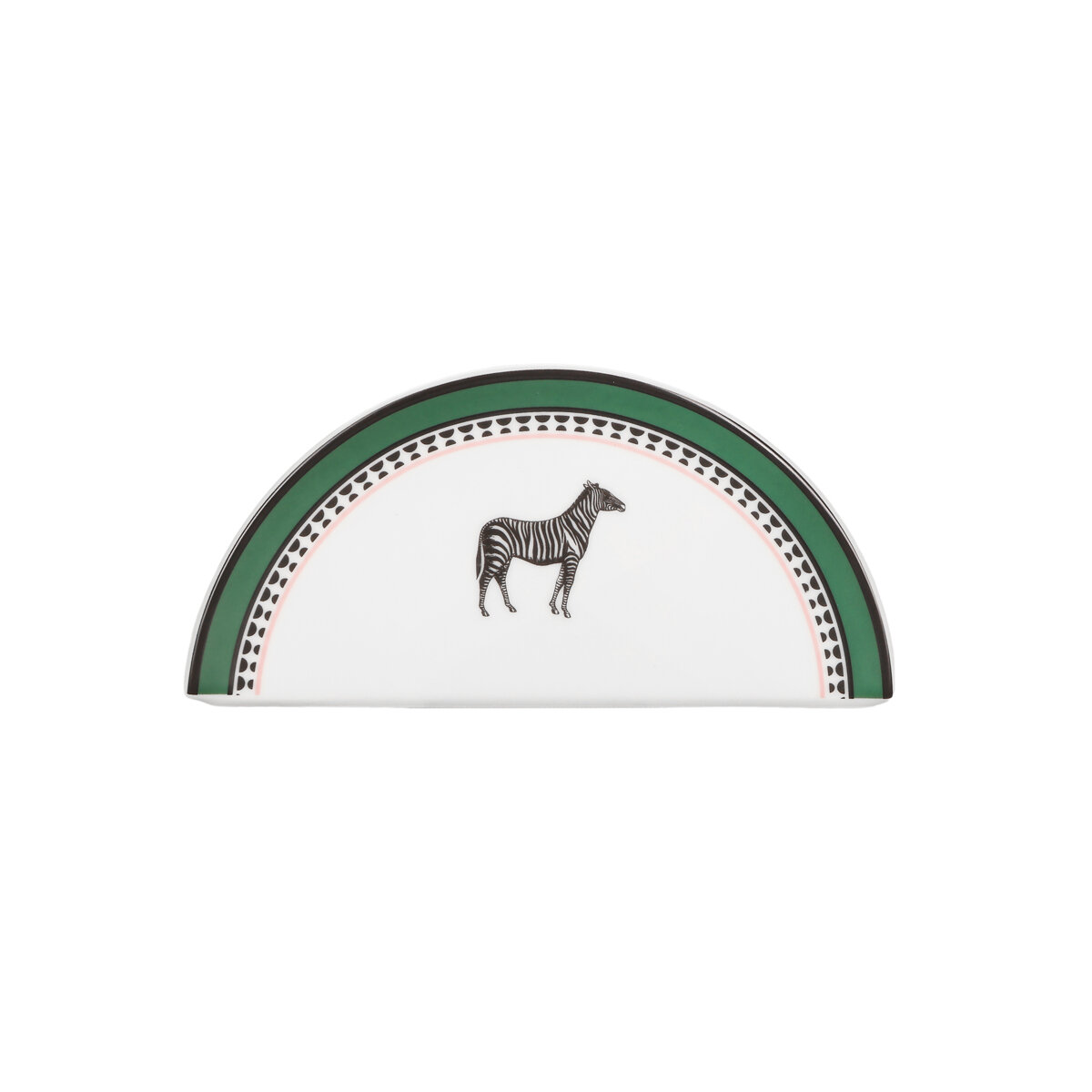 Şık yarım ay (kemer) formu sayesinde peçetelerinizi estetik bir şekilde bir arada tutarken, masanızda adeta dekoratif bir obje gibi sergilenir. Saf beyaz porselenin merkezinde yer alan siyah-beyaz zebra figürü, tasarımı çevreleyen canlı orman yeşili dış çerçeve ve ince geometrik desenli şerit ile mükemmel bir uyum yakalar.