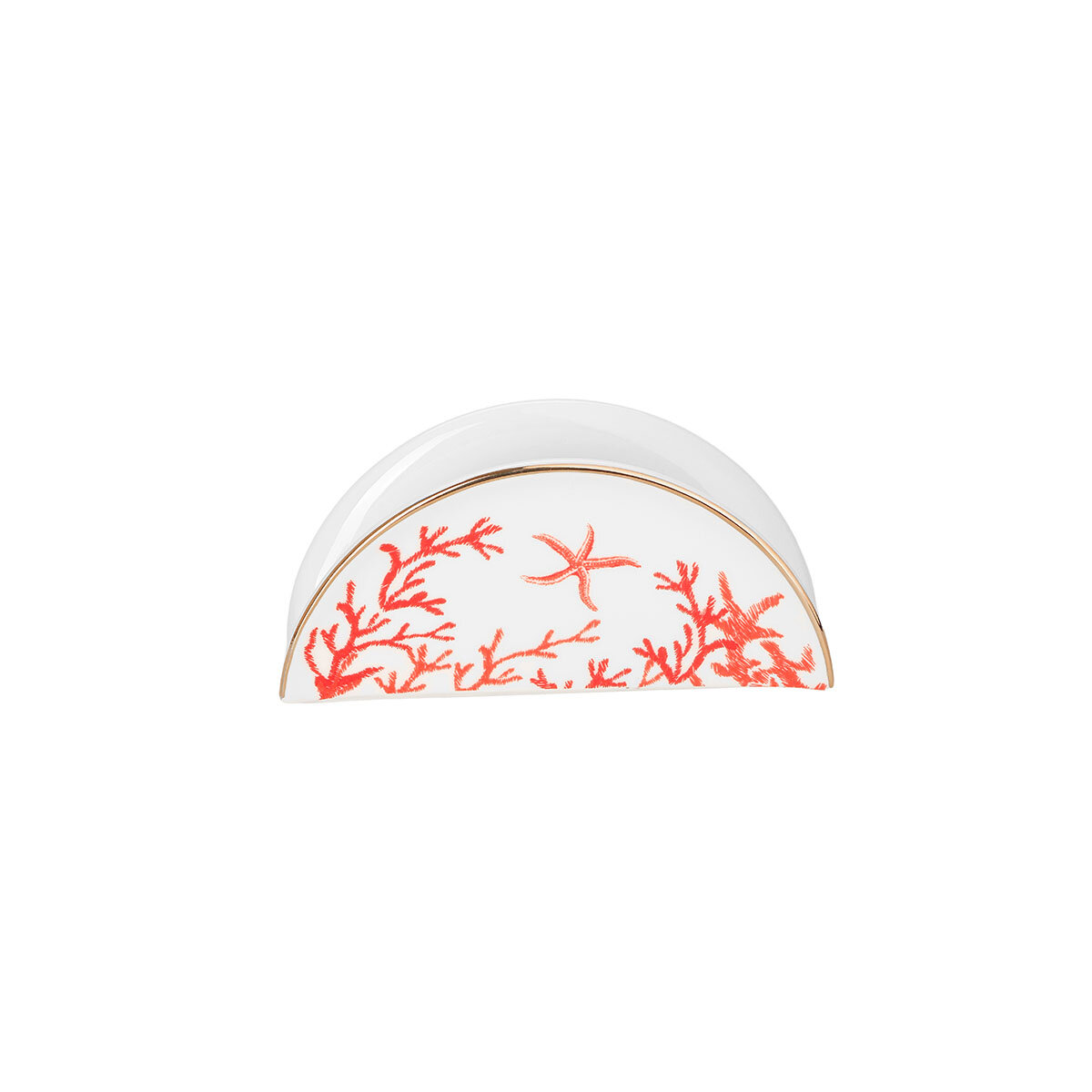 Şık yarım ay (kemer) formu sayesinde peçetelerinizi estetik bir şekilde bir arada tutarken, masanızda adeta dekoratif bir marin objesi gibi sergilenir. Saf beyaz porselenin üzerini süsleyen canlı kırmızı mercan dalları ve tam merkezdeki detaylı deniz yıldızı figürü, koleksiyonun dinamik temasını vurgular. Tasarımı kusursuzca çevreleyen ince gold yaldız şerit ise bu enerjik görünüme lüks ve premium bir bütünlük katar.