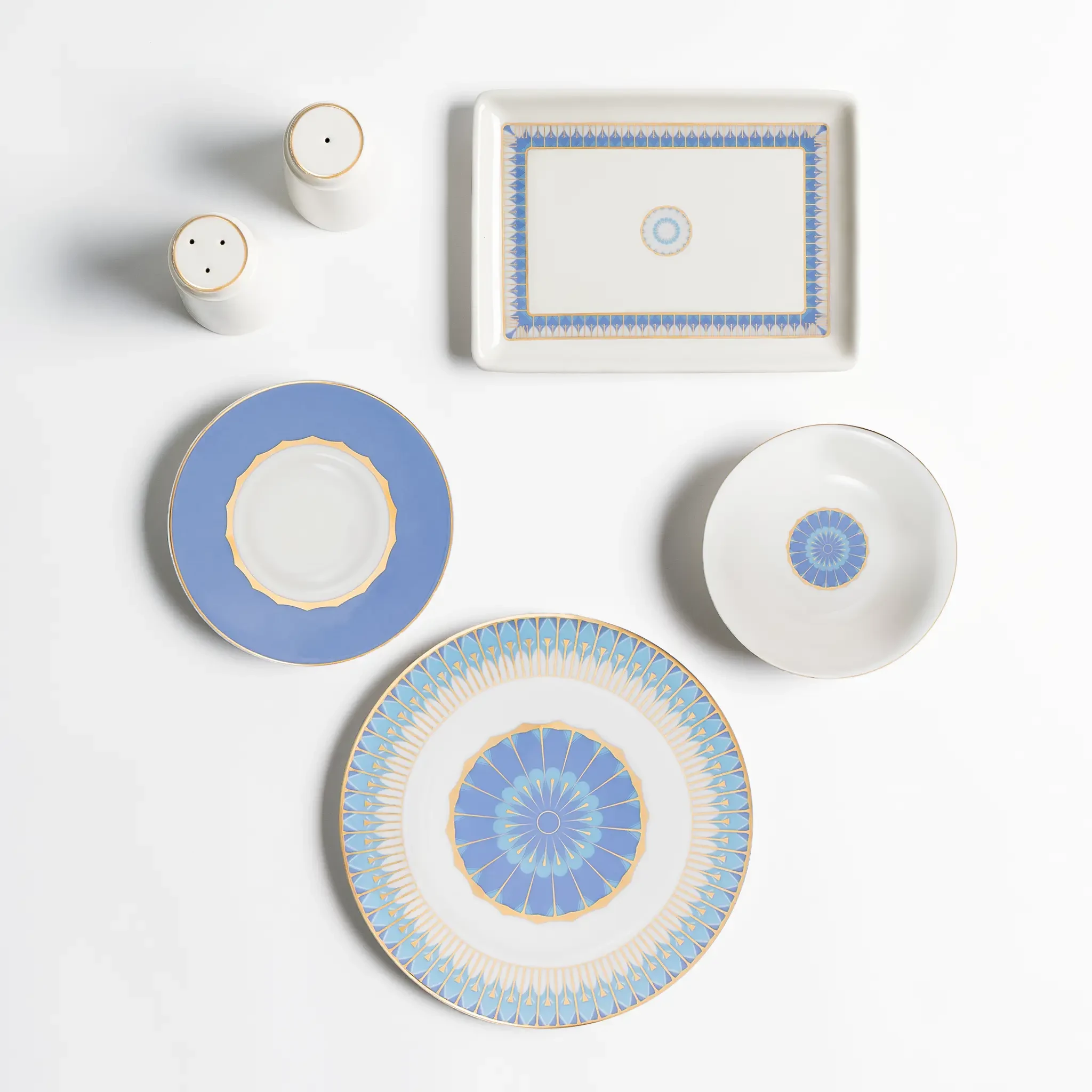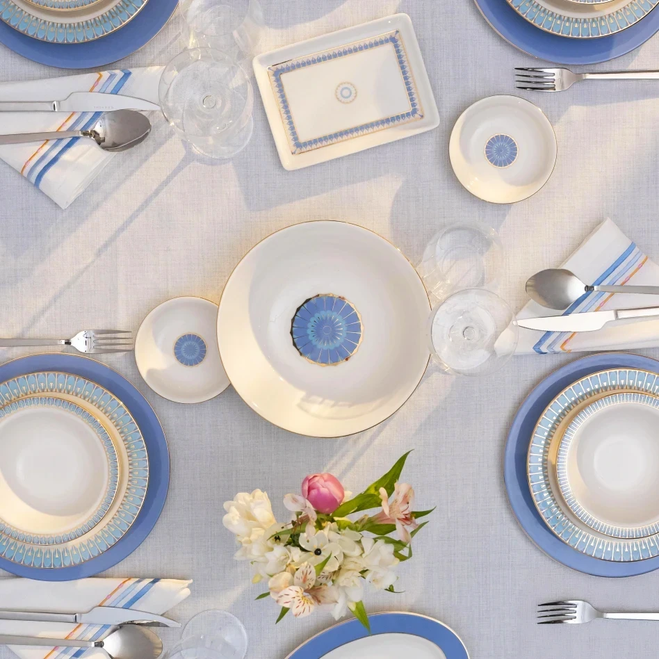 Giselle Mavi Gold koleksiyonu, zarif mavi tonları ve gold detaylarıyla sofralarınıza lüks ve şıklık katıyor. Estetik tasarımı ve kaliteli malzemesi sayesinde özel davetlerden günlük kullanıma kadar her sofraya zarafet ve sofistike bir hava kazandırıyor.