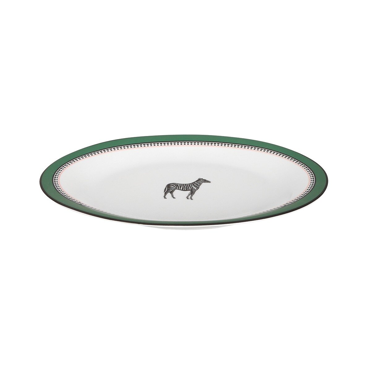Geniş orman yeşili kenarı ve bu kenarı beyaz porselenden ayıran ince geometrik desenli şerit, tasarımı kusursuzca çerçeveler. Merkezdeki asil siyah-beyaz zebra illüstrasyonu ise koleksiyonun ruhunu masanıza taşır. Şık peynir tabakları, mezeler, ara sıcaklar veya taze meyve servisleri için hem estetik hem de son derece kullanışlı bir alternatiftir.