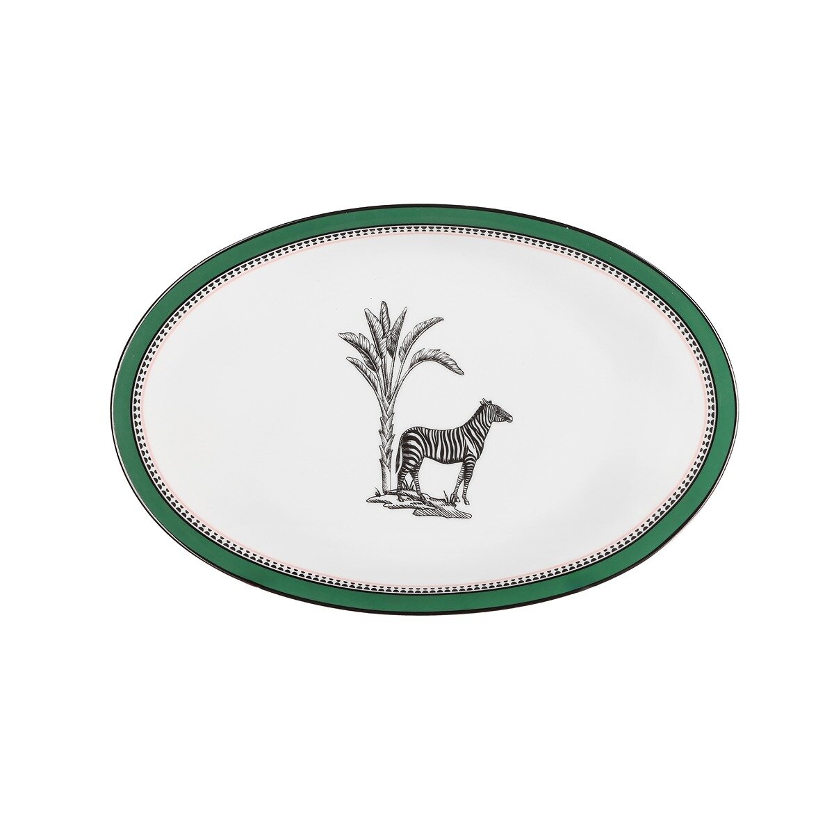 Geniş orman yeşili kenarı ve bu kenarı beyaz porselenden ayıran ince geometrik desenli şerit, tasarımı kusursuzca çerçeveler. Merkezdeki asil siyah-beyaz zebra illüstrasyonu ise koleksiyonun ruhunu masanıza taşır. Şık peynir tabakları, mezeler, ara sıcaklar veya taze meyve servisleri için hem estetik hem de son derece kullanışlı bir alternatiftir.