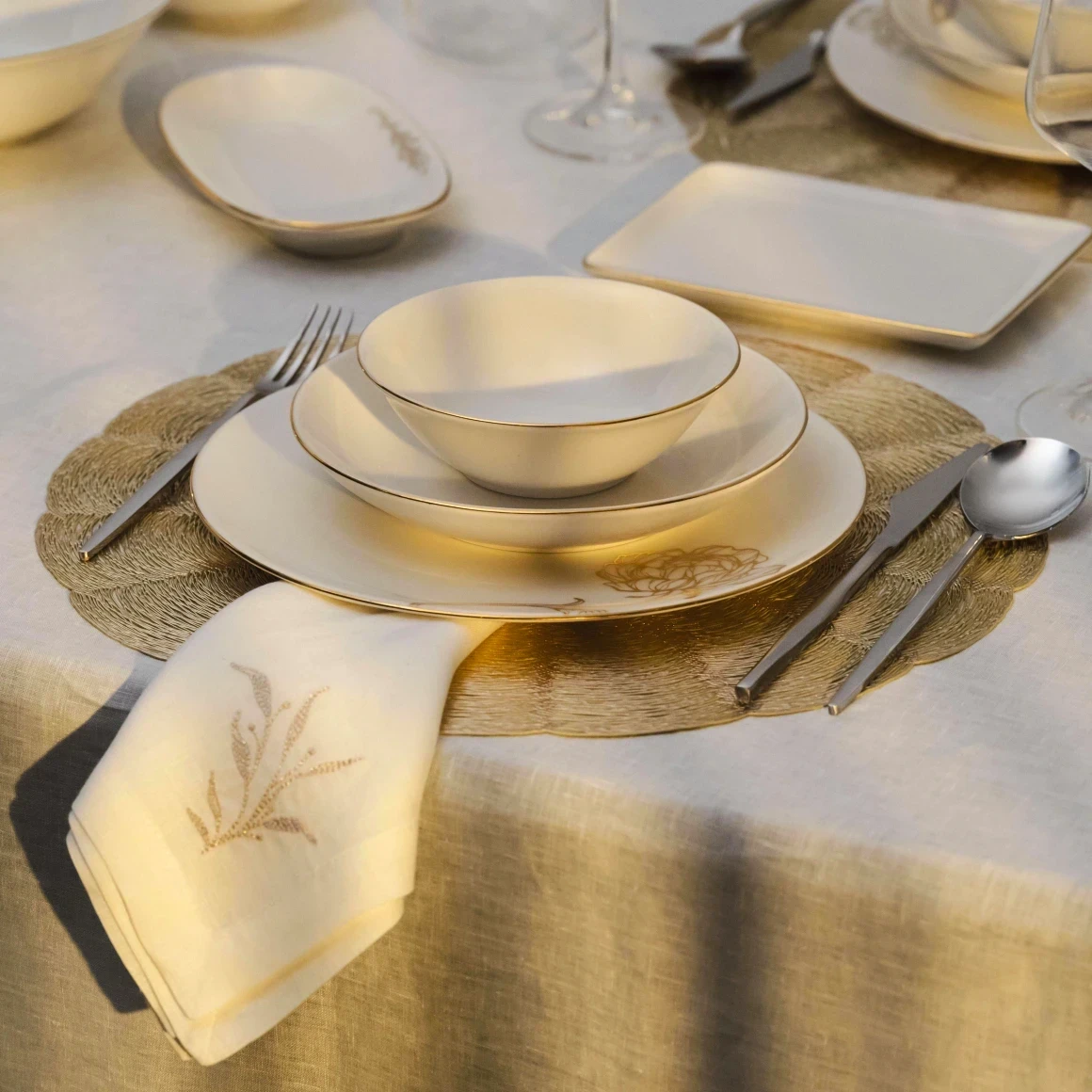 Lyra Gold koleksiyonu, porselen ve altının göz kamaştırıcı ışıltısını sofralarınıza taşıyor. Zarif tasarım detayları, yemek sunumlarınızı lüks bir deneyime dönüştürüyor ve her öğünü unutulmaz kılıyor.