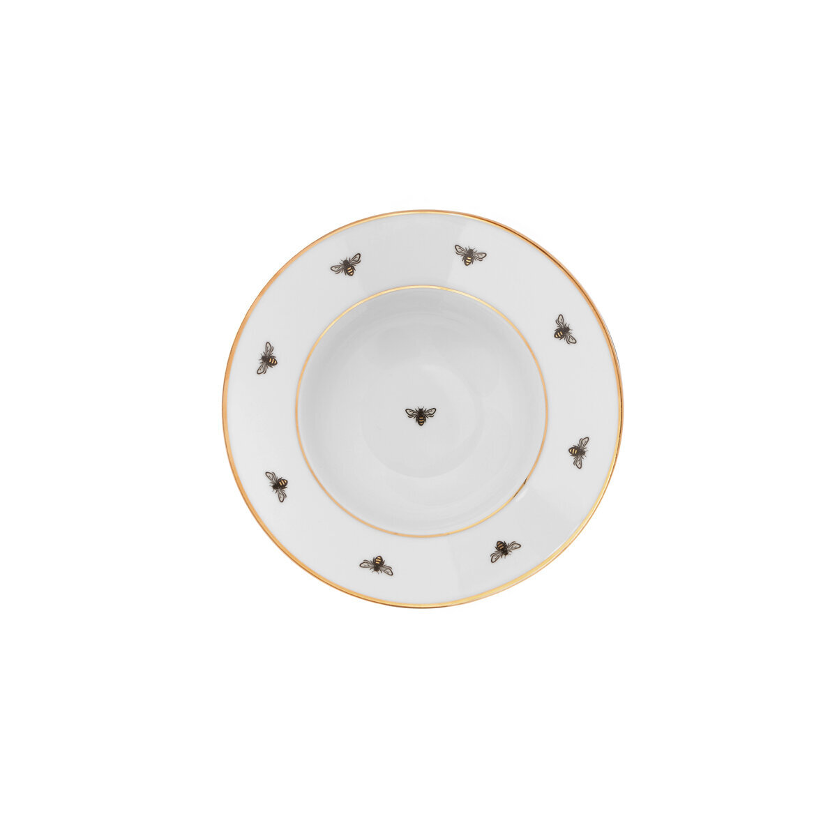 Geniş porselen kenarları hem içten hem de dıştan çevreleyen ince altın yaldız şeritler, kaseye lüks bir çerçeve çizer. Kenarlara eşit aralıklarla ve kâsenin tam merkezine özenle yerleştirilmiş ikonik siyah-altın arı (bee) motifleri ise koleksiyonun imza duruşunu sergiler. 17 cm'lik çapı ve ideal derinliği sayesinde yemeklerinizi adeta şık bir tuval üzerinde sunmanıza olanak tanır.