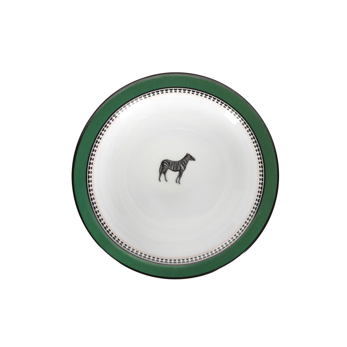 Saf beyaz porselenin tam merkezinde yer alan ikonik siyah-beyaz zebra figürü, tasarımın asil karakterini vurgular. Çevresini saran doygun orman yeşili geniş kenar ve bu kenarı içten çevreleyen ince geometrik desenli şerit, kâseye estetik bir derinlik kazandırır. İdeal boyutu ve modern formuyla bu tasarım, günlük kullanımdan en şık davet sofralarına kadar her sunumunuzu özel kılmaya adaydır.